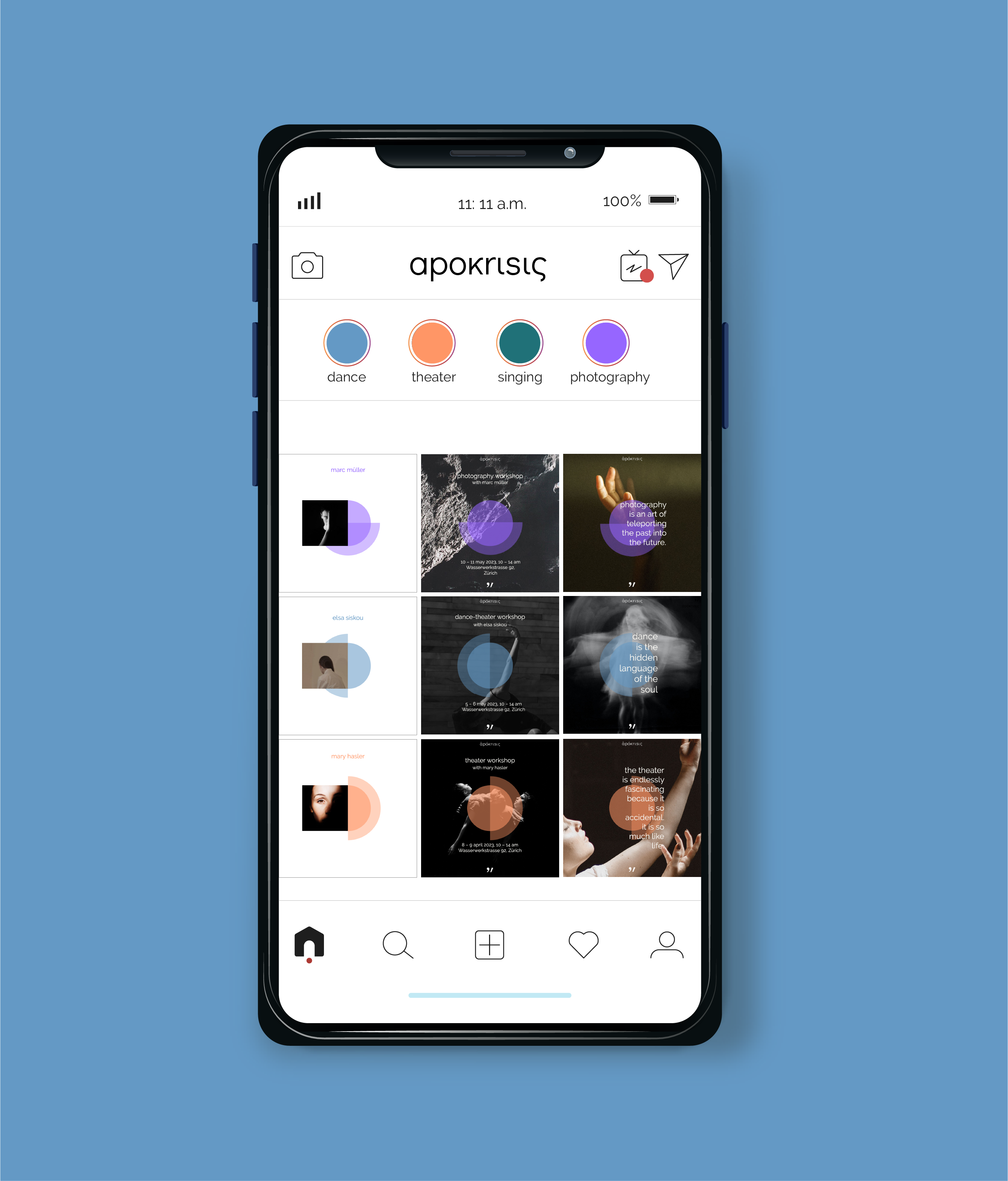 apokrisis is a new upcoming online platform for art creative seminars and workshops! This project emphasises on the concept of the instagram profile, because it is a modern and easy way to communicate. A website is coming soon.